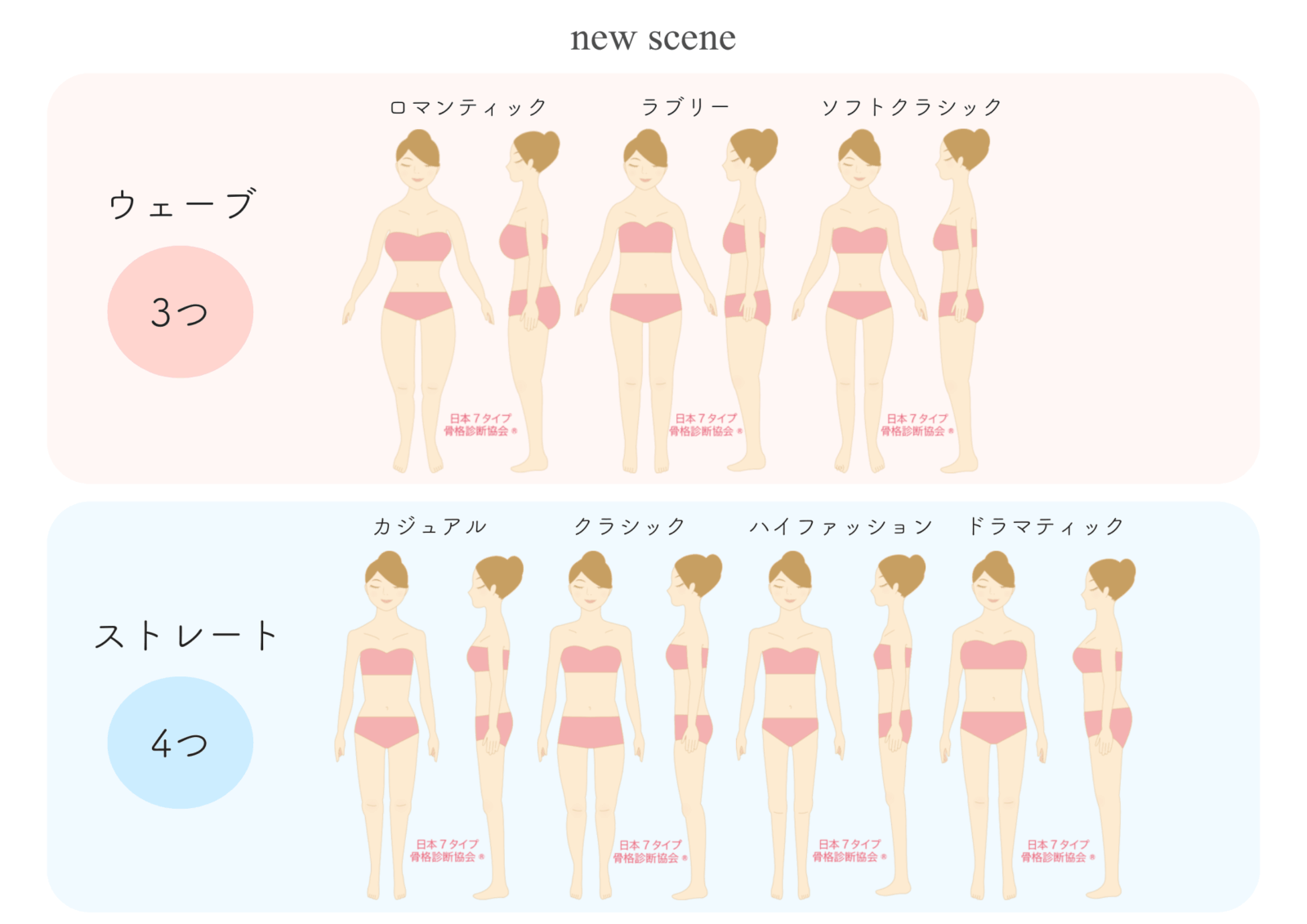 7タイプは身体のラインが直線的なストレートと、身体のラインが曲線的なウェーブの、大きく2つに分類し、さらにそこから細分化します。