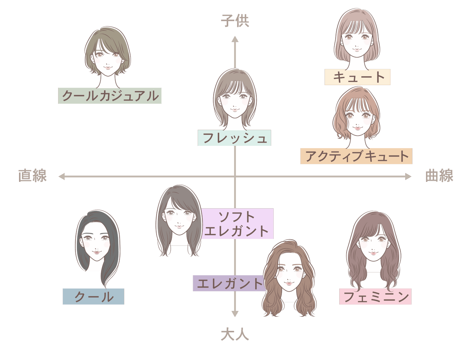 【大人顔・子供顔】【直線・曲線】の2軸で分析し、以下の8タイプに分類されます。